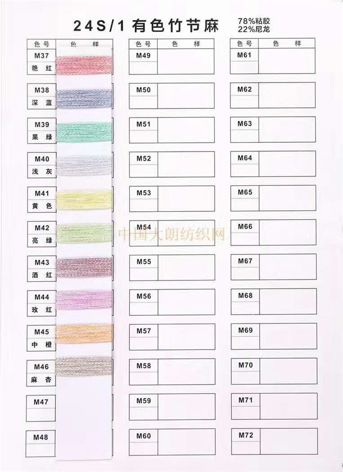 24N竹节麻 由78%粘胶 22%尼龙组成,是春夏毛织,针织首选产品,具有凉快,干爽,防辐射,防静电,防过敏,减少排汗的作用。